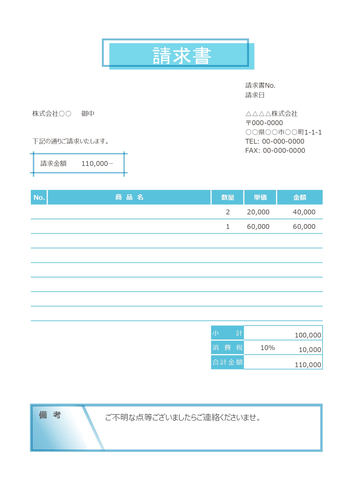 水色を基調として、おしゃれ&スタイリッシュにデザインされた請求書です。モニターに映えるカラーで、Webでのやり取りにもぴったりです。表は全て計算式が入っています。消費税は10%で自動計算されます。