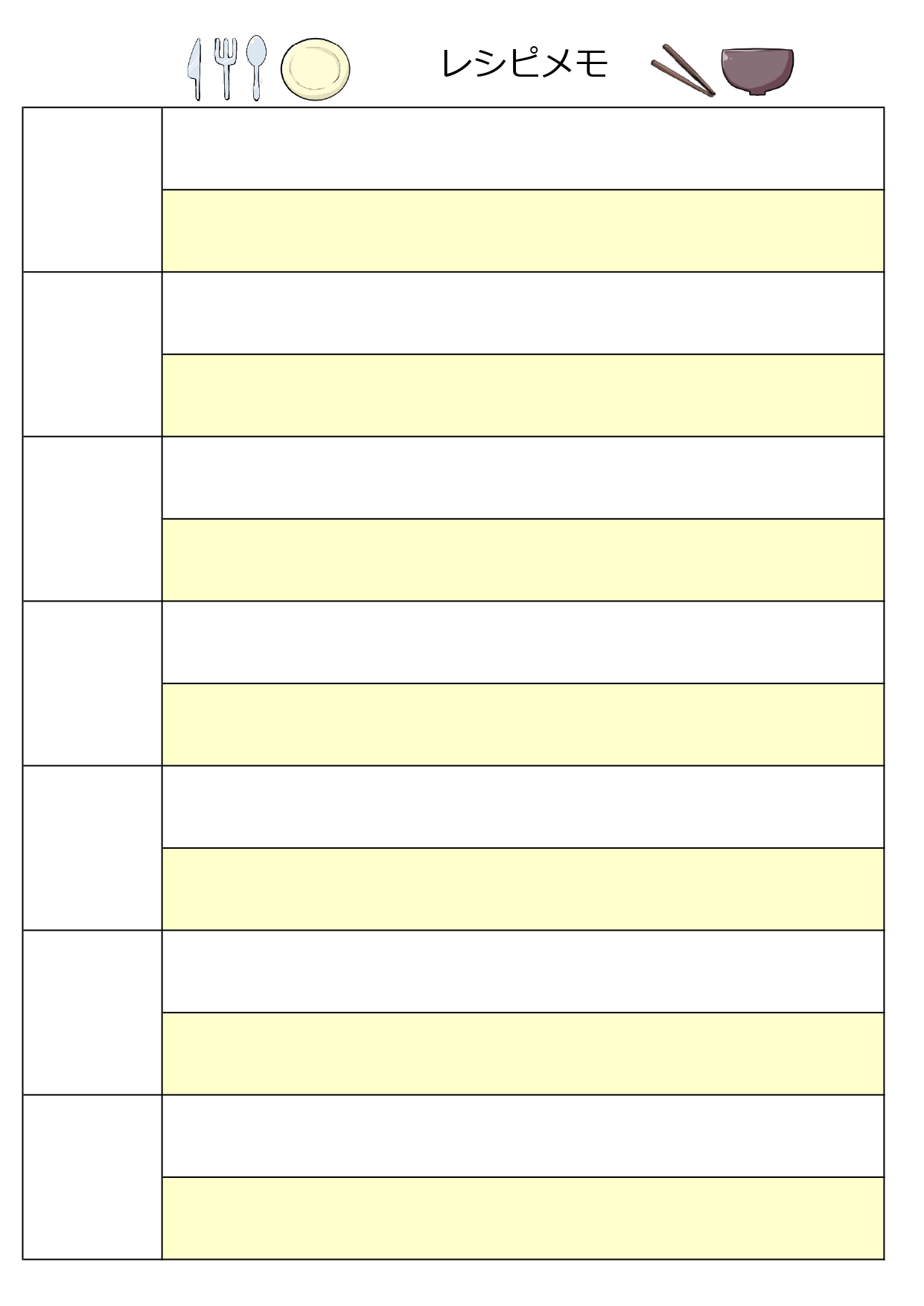 レシピを作成する際、料理の工程を残しておくと便利です。7つの工程を写真やイラストを記載できるような縦向き構成となっており、色分けされてレシピが書き込める便利な仕様で作成されています。上部には、レシピメモのタイトル、カトラリーや皿、箸、お椀の可愛らしいイラストが配されているところも遊び心を感じさせるポイントです。