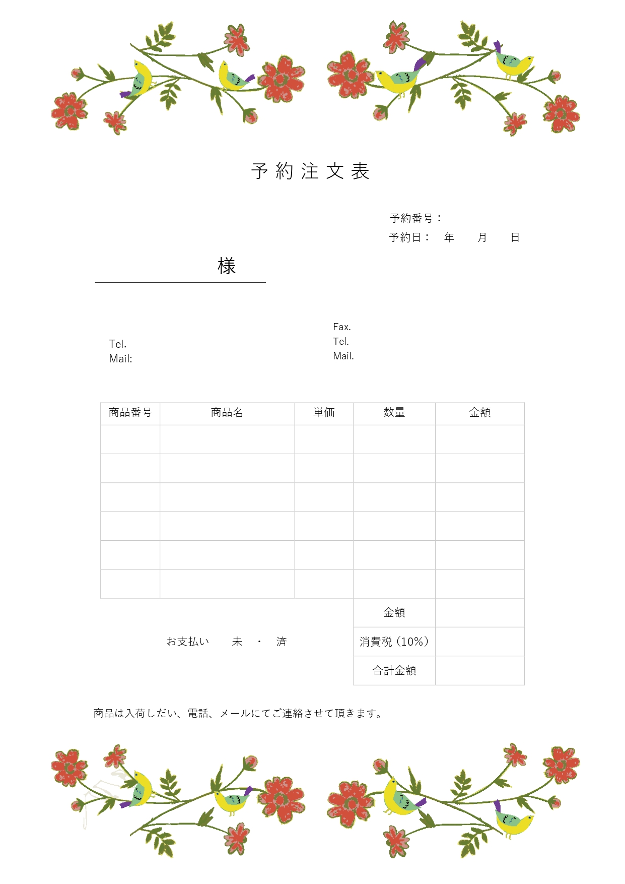 その花をモチーフにカラフルな小鳥も参加させて、予約注文表テンプレートを作成しました。ジャンルを問わず多岐にお使い頂けたら嬉しいです。印刷し、お客様めいめいが書き込んで申し込みをして頂くか、スタッフが入力するという方法でお使いください。テキストは編集可能になっていますが、フォントの変更はお勧めできません。