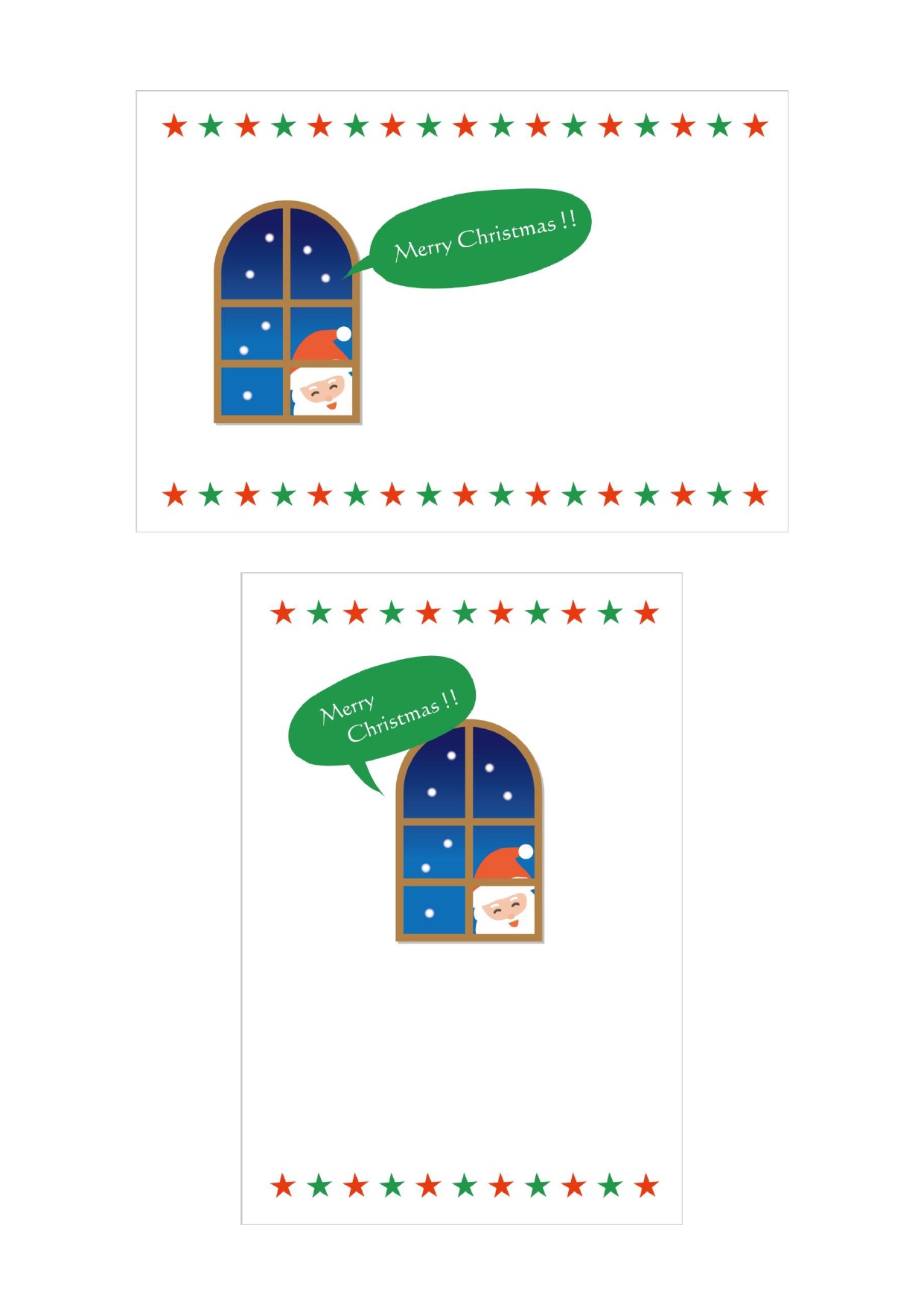 クリスマスカードとしてお使いいただけるフォーマットです。プレゼントを届けたサンタクロースが、窓の外からそっと家の中を覗いている微笑ましいイラストになっております。ワンポイントのイラストとクリスマスカラーの星がカードを彩り、クリスマス気分を盛り上げてくれるカードです。シンプルなデザインですので、性別や年齢を問わずにお使いいだけるようになっており、おじいちゃん・おばあちゃんからお孫さんへ、また親御さんからお子さんへのプレゼントに添えていただいたり、お友達に送る際にもご利用ください。