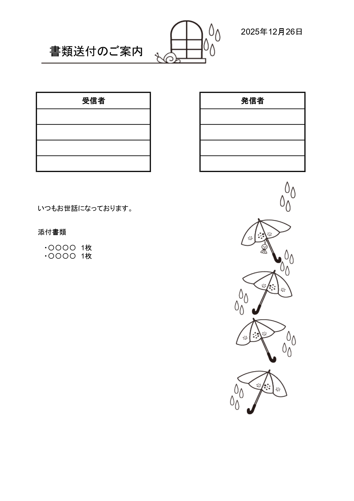 6月に出す少しかわいい送付状をお探しの場合は、おすすめのデザインとなります。傘やカタツムリが、題名部分と縦に描かれており、6月を連想するのにピッタリなデザインです。6月以外の時期でも利用可能なテンプレートとなります。