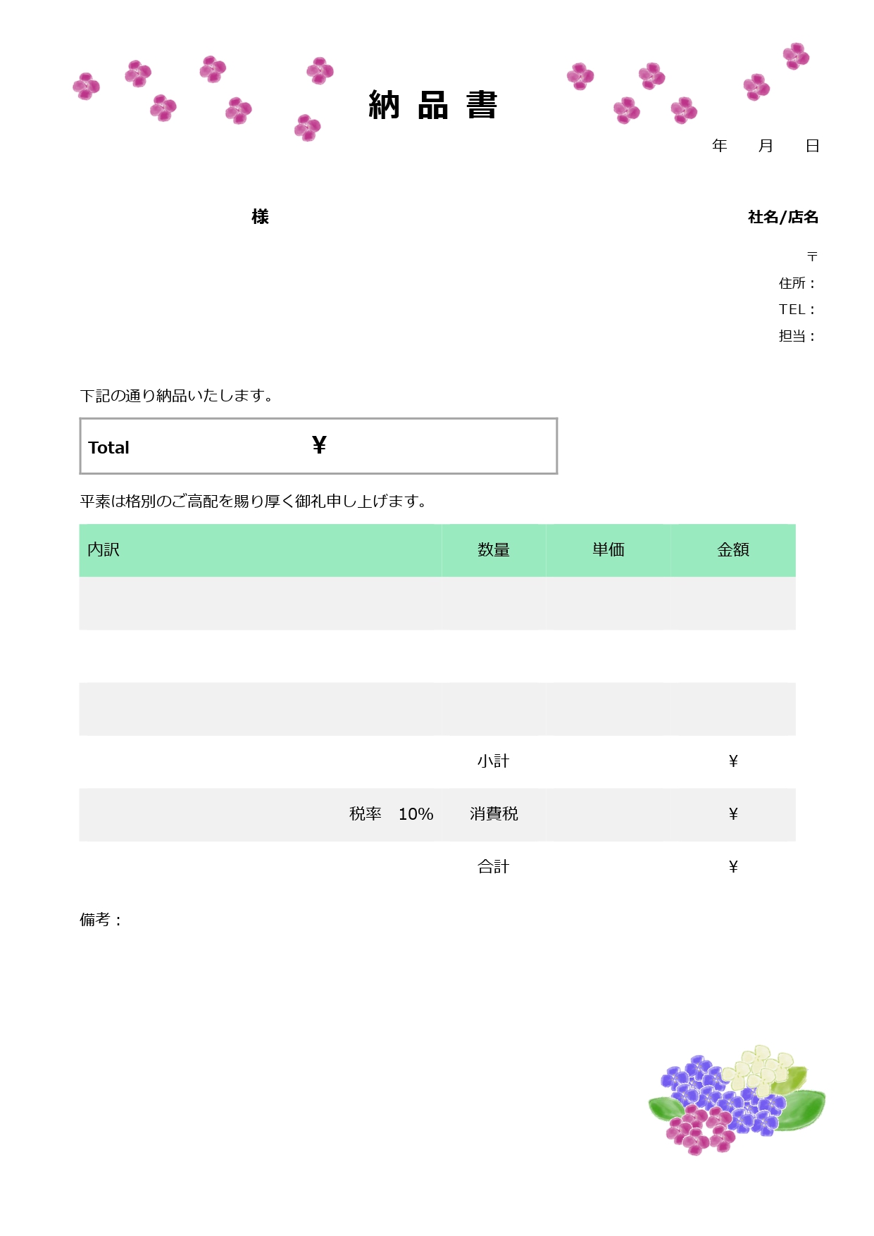 オンラインショップや個人経営者におすすめの、かわいいお花のイラストが入った納品書のテンプレート!