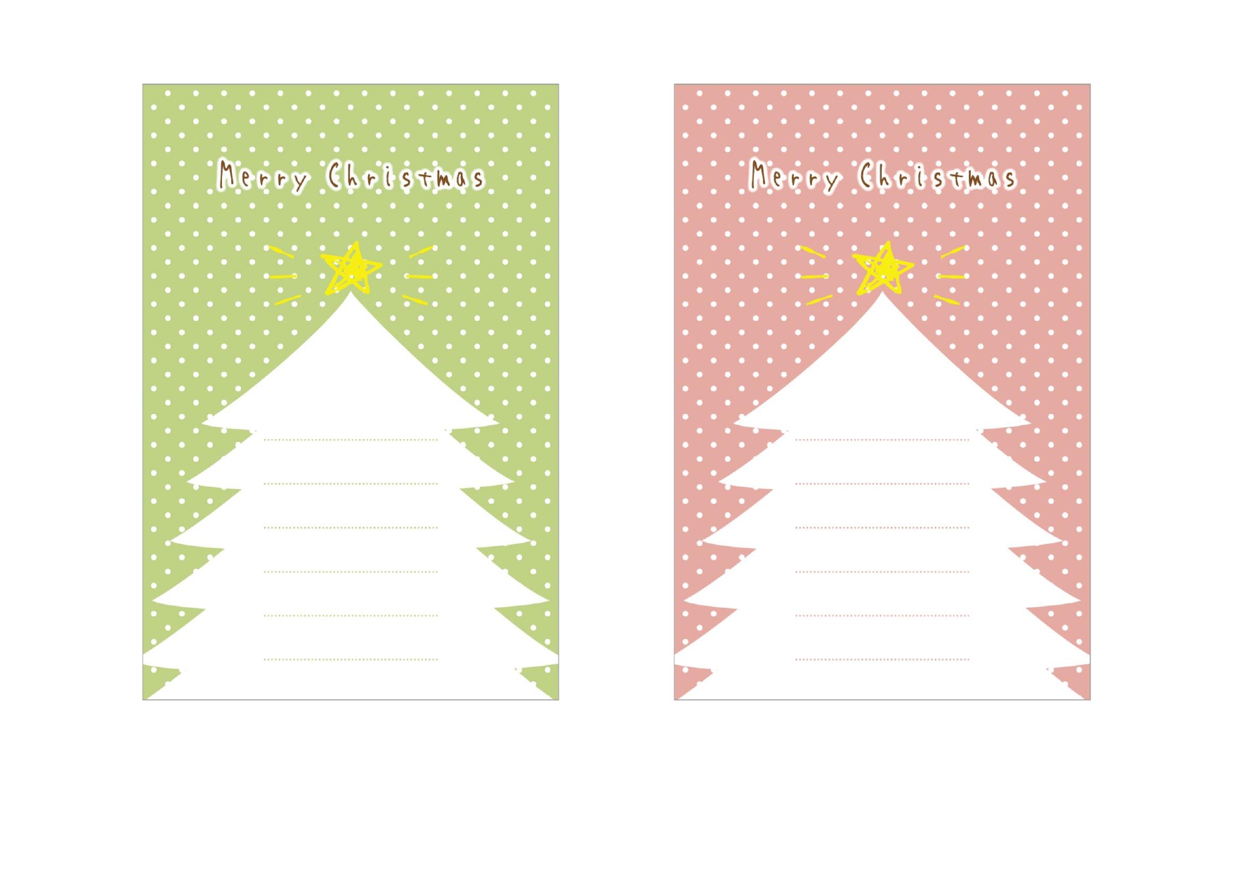 デザインは、クリスマスに雪が静かに降っているイメージで作成致しました。手書き風の『Merry Christmas』とツリーの上に光る星のイラストが、ほっこりと癒してくれる優しいテイストになっております。背景の色は、ライトグリーンとくすんだピンク色の2パターンご用意しましたので、お好みによってお使いください。